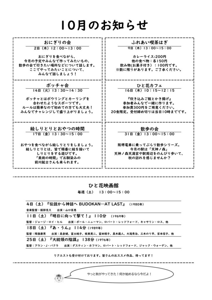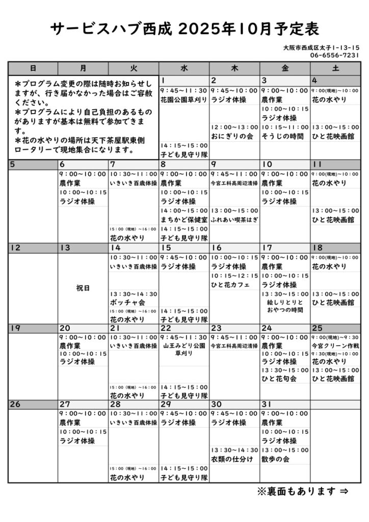 サービスハブ西成2025年10月予定表 サービスハブの活動 2025.09.27 少し朝晩が涼しくなってきましたね。みなさん体調を崩していませんか? 日中は少し暑いので、何を着ようか迷います・・・ ということで、早いですね。10月です。10月の予定表を9月中に載せれた! ぜひチェックして参加してみてくださいね。 10月は・・・久々「ひと花カフェ」でかき揚げを作ります。季節の炊き込みご飯も!9月の「ひと花カフェ」は初めてのそうめんチャンプルに挑戦しましたよ。完成品は思ったものと違いましたが^^;美味しかったです。またいつかリベンジしたいですね〜。