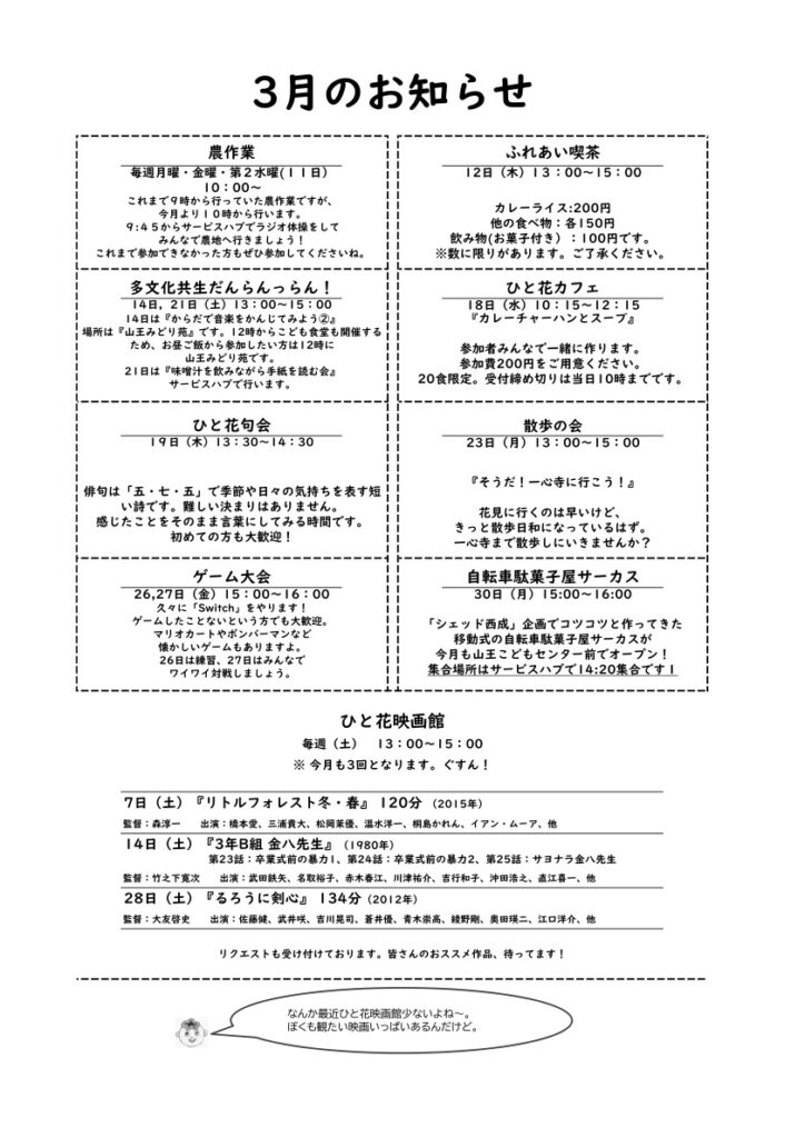 毎週月曜・金曜9時〜行っている農作業ですが、3月より10時開始に変更します。