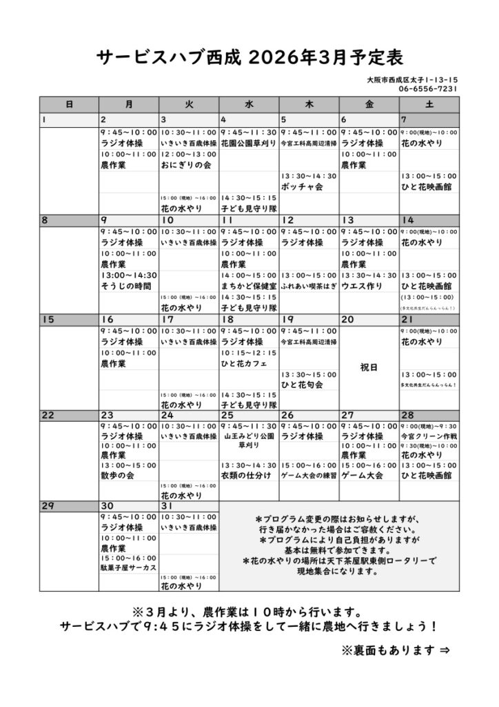 毎週月曜・金曜9時〜行っている農作業ですが、3月より10時開始に変更します。